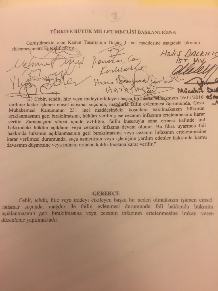 an itibariyle cnn türk'te nurhayat kayışoğlu'nun açıkladığı ve akp hükümeti'nin meclise verdiği önergedir. çocuk bu yaaa tecavüz ne demek? üstüne birde tecavüzcüsüyle evlendirmek? bu nasıl bir zihniyettir allah belanızı versin hepinizin amk.!!