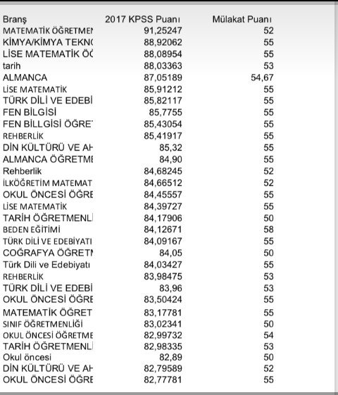 şu listede de branşlarında derece yapan öğretmen adaylarının notları ve mülakattan verilen düşük puanlar.