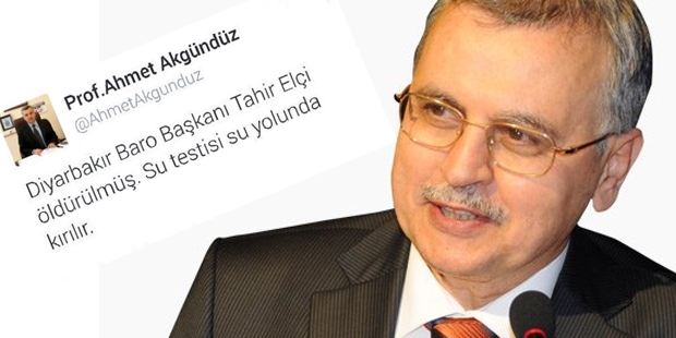 "tahir elçi, prominent human rights lawyer, peace activist and chairman of diyarbakır bar association is assasignated on 28/11/2015 in diyarbakir while he was making press release on how wars disrupt nature and culture. ahmet akgündüz, proffesor at rotterdam islamic university, posted an idiom in turkish on his verified twitter account ahmet akgündüz that means 'tahir elçi died on the way he deserved'. as lawyers in turkey, we condemn his words and we urge relevant authorities with this call to action over prof. ahmet akgündüz, regarding that violation of human rights by cheering the murder of a human rights and peace activist.