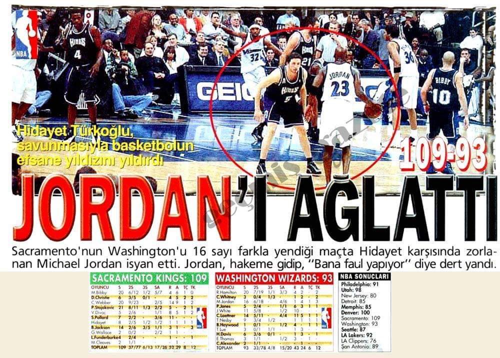 zamanında hidayet türkoğlu nba macerasında ilk senelerinde jordan'ın sanırım emeklilik sonrası döndüğü washington wizards ile karşı karşıya gelmişti ve bir süre sahada kalmıştı. hidayet 6-7 sayı mı ne atmıştı ve maç içinde bir kere jordanla bire bir kalmıştı . hidayetin o dönem takımında önemli bir rolü yoktu ve maçta da belirleyici bir katkısı yoktu sadece benchten gelen bir oyuncuydu ama türk gazeteleri "hido jordan'ın eline verdi" gibi abzürt başıklar atmıştı. hidayetin jordan karşısında oynaması bile büyük gururdu.